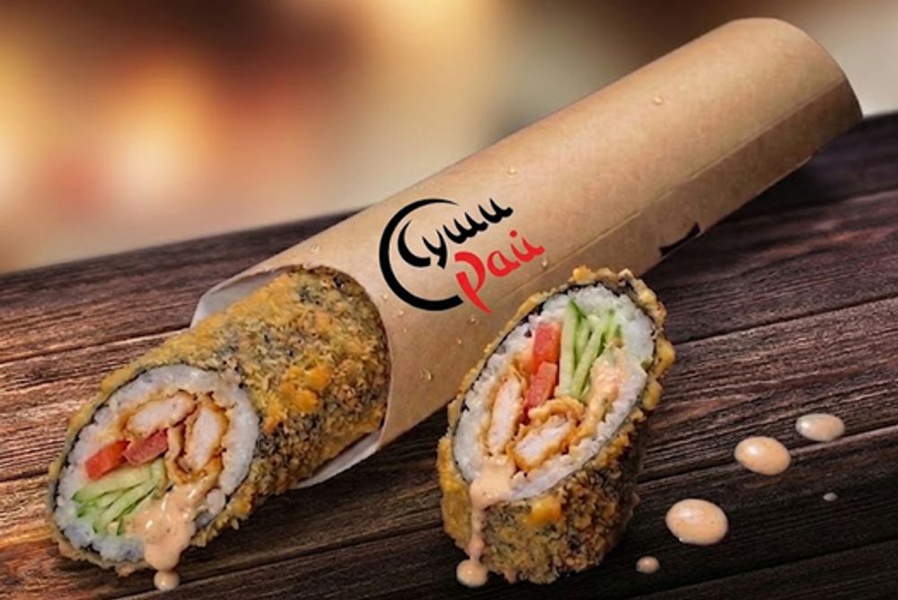 Куриное филе, помидор, огурец (свежий), рис, водоросли нори, сырный соус, кляр темпура. Упакована в индивидуальную крафтовую упаковку.