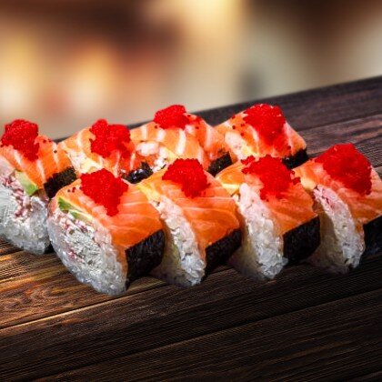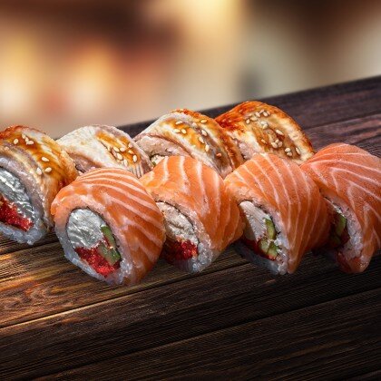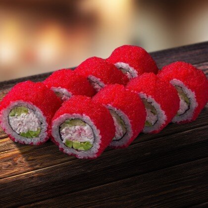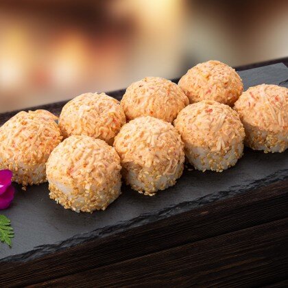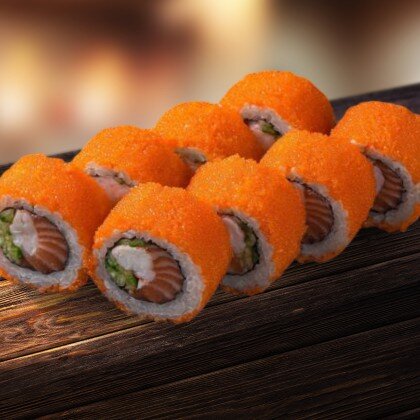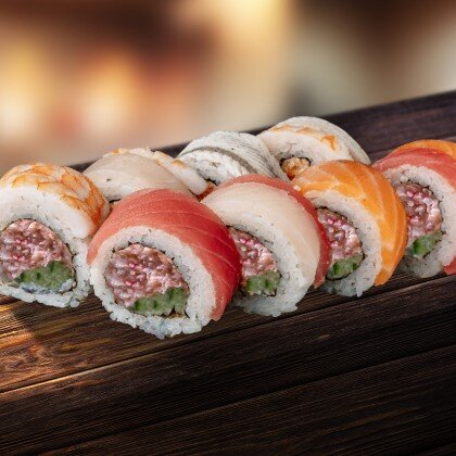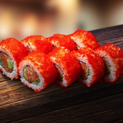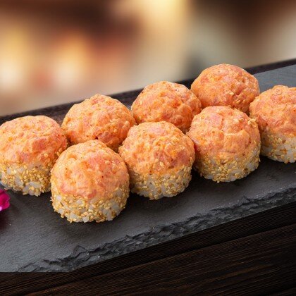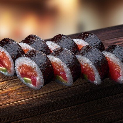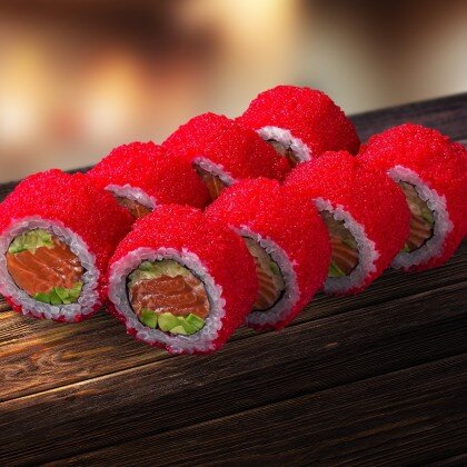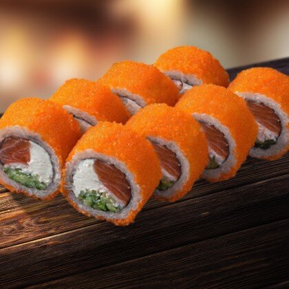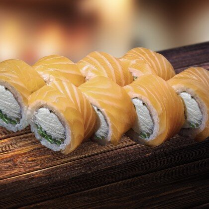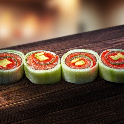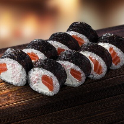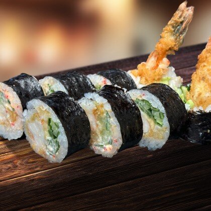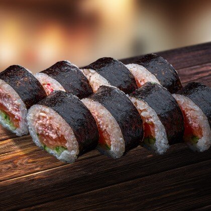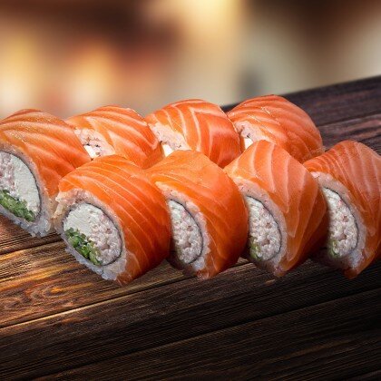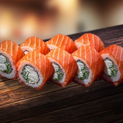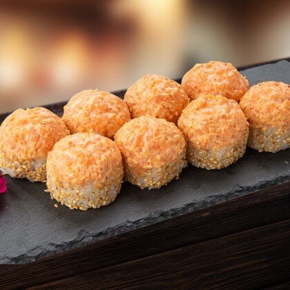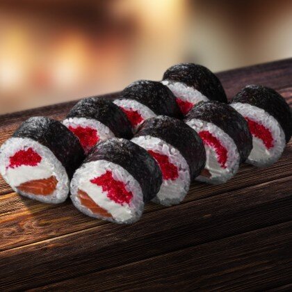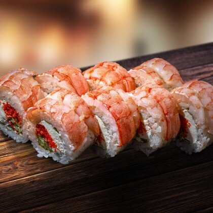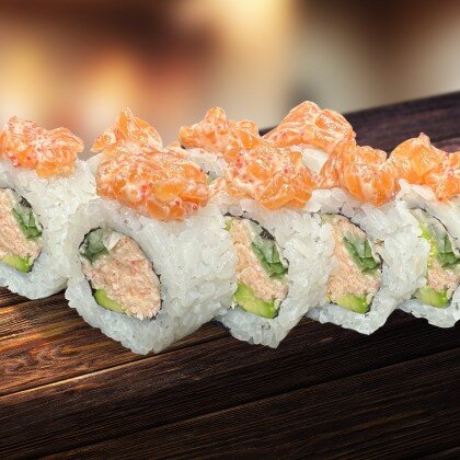 Лосось, креветка тигровая, огурец, сыр CREMETTE, рис, водоросли нори, спайс соус, зеленый лук, кунжут.