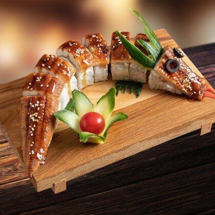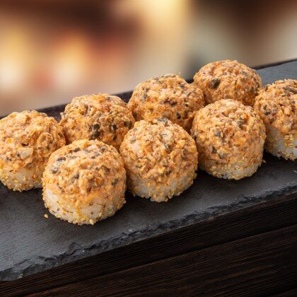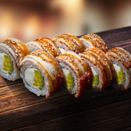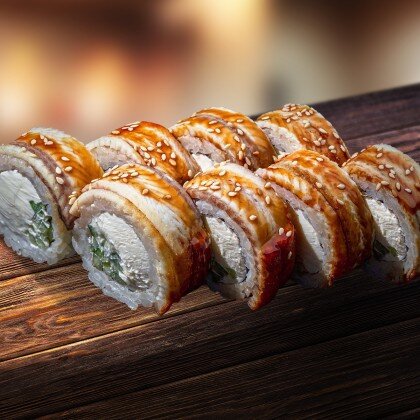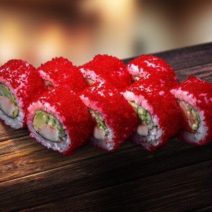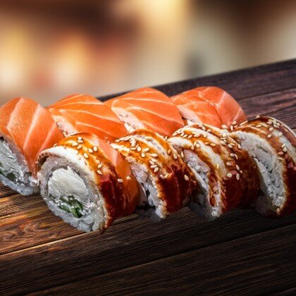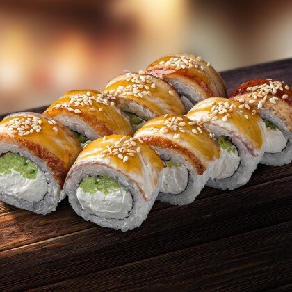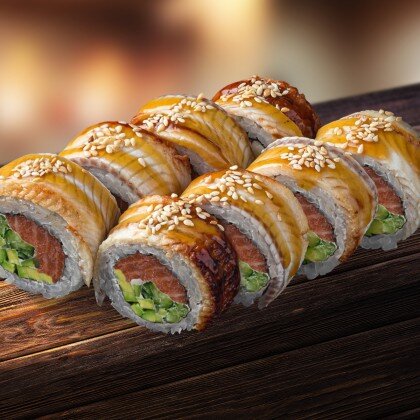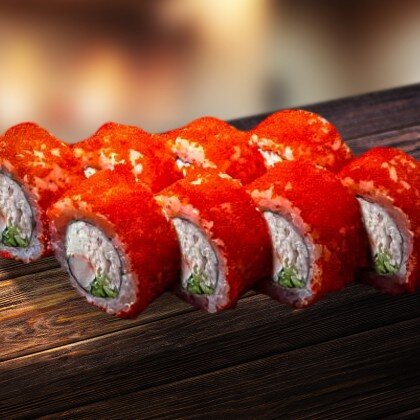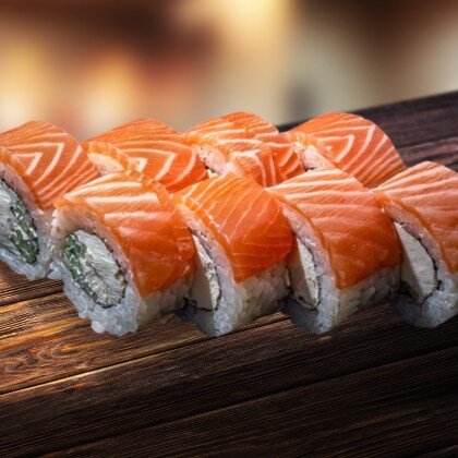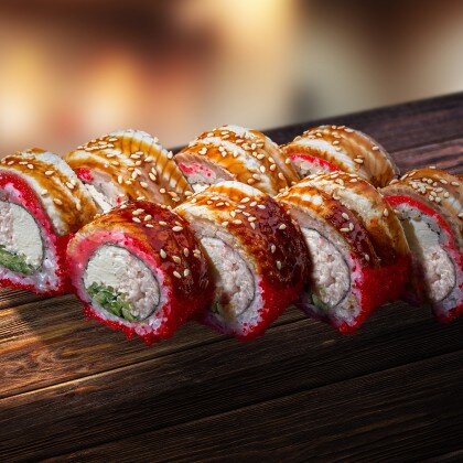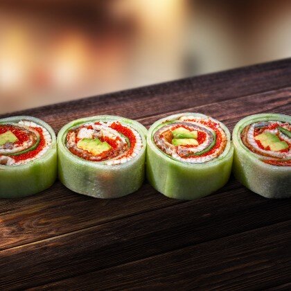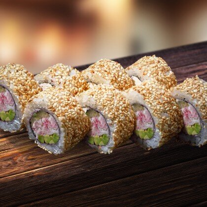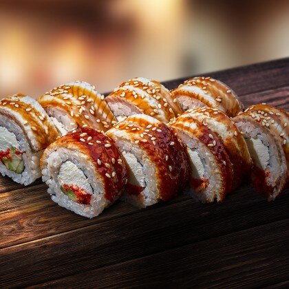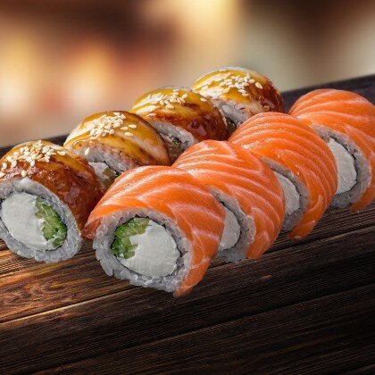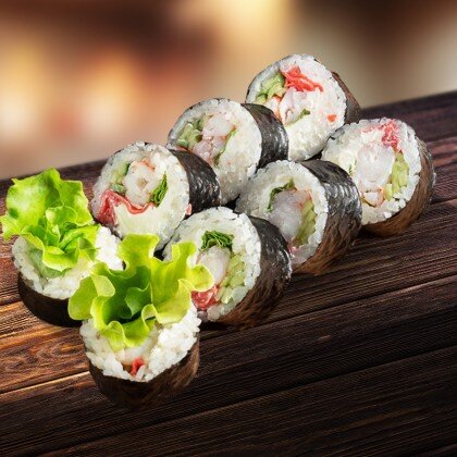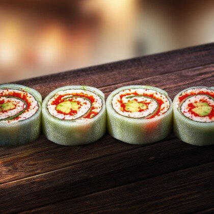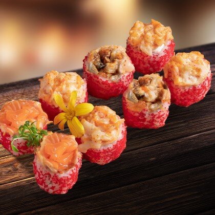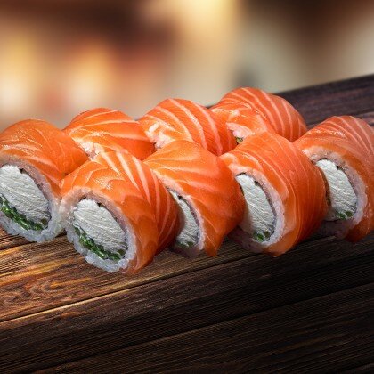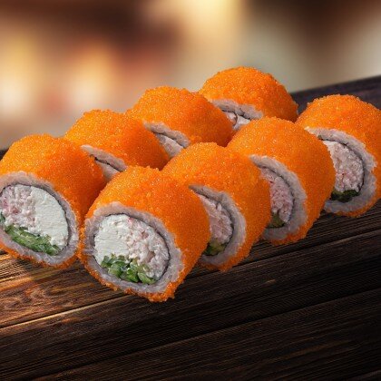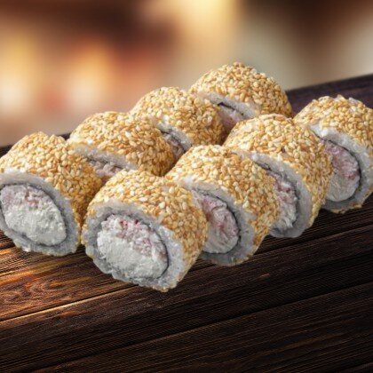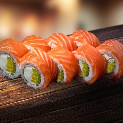 Лосось, креветка тигровая, огурец, сыр CREMETTE, рис, водоросли нори, спайс соус, зеленый лук, кунжут.